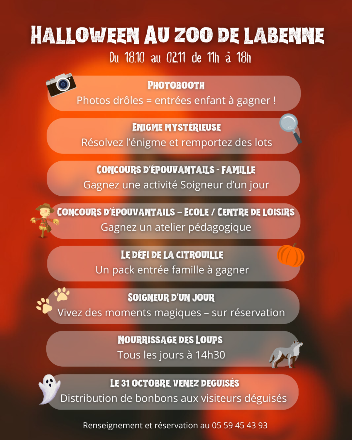 Durant les vacances de la Toussaint (du 18 octobre au 2 novembre inclus ), notre parc se pare de décorations automnales et vous propose des animations spéciales Halloween !