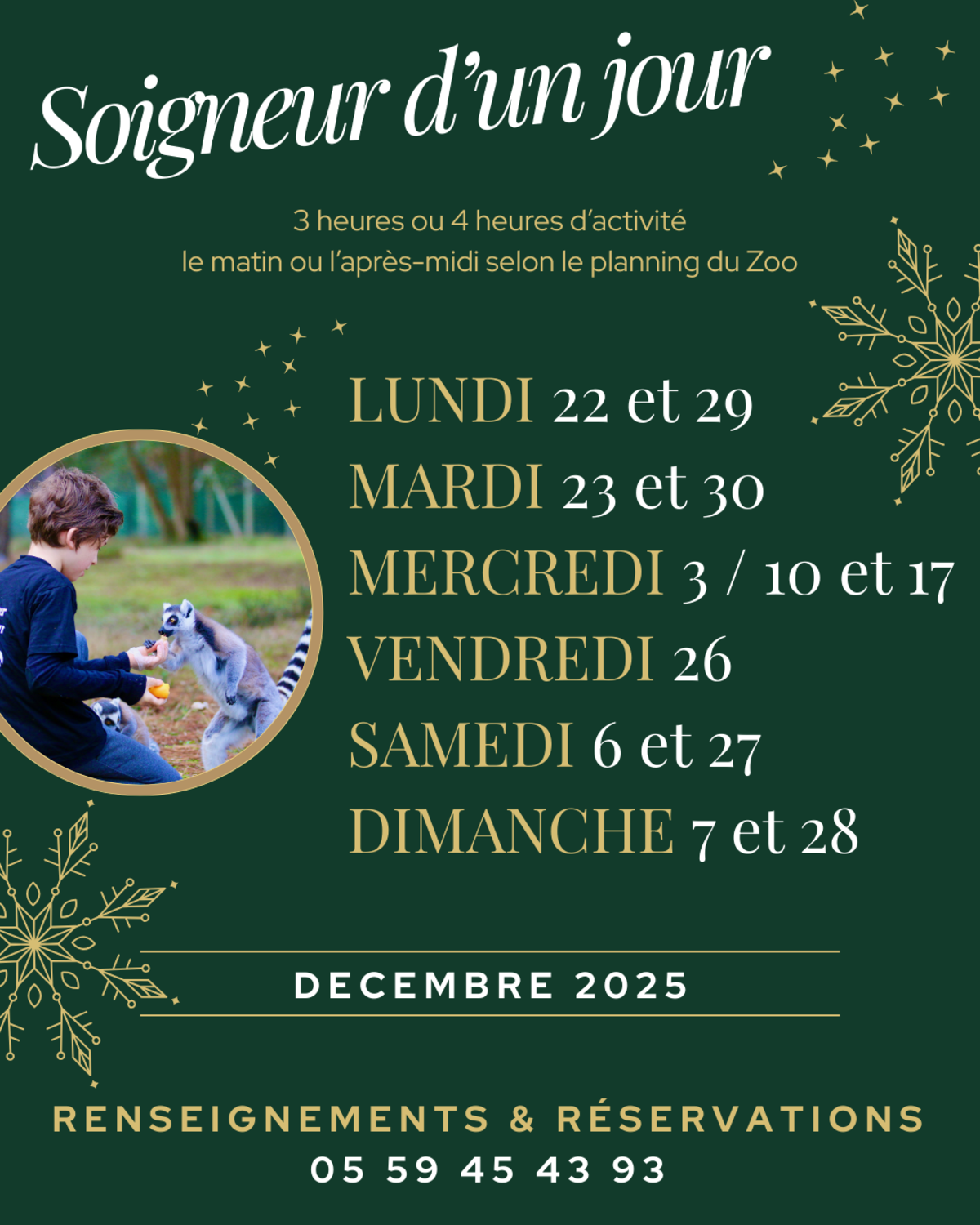 Venez passer 3 ou 4 heures au sein du Zoo, où, encadrés par un animateur vous vivrez le quotidien d’un parc zoologique.